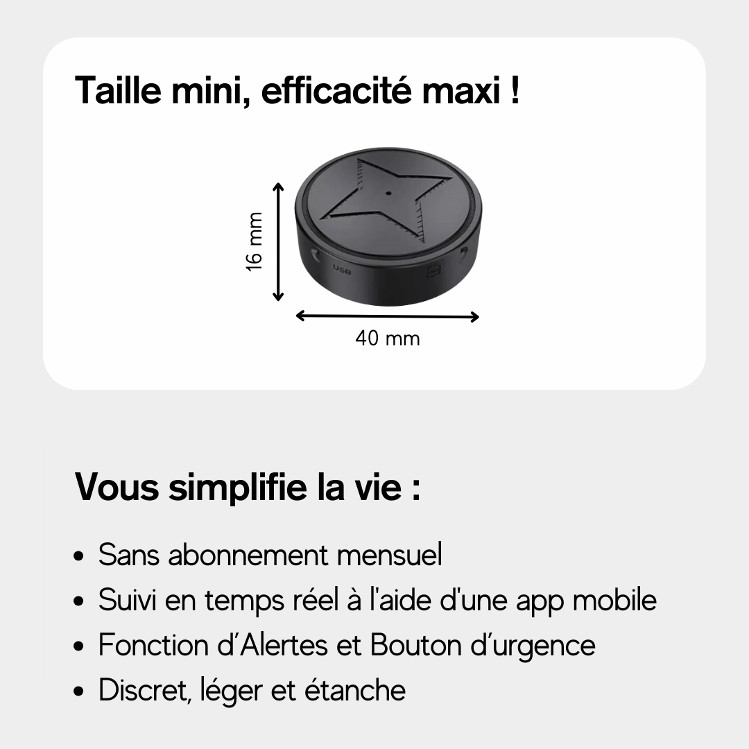 Grâce à sa taille compacte, sa facilité d'installation et ses nombreuses fonctionnalités, ce GPS est l'outil idéal pour une surveillance efficace et discrète.